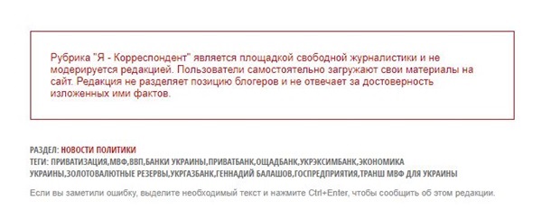 Według ukraińskiego ustawodawstwa, to autor artykułu powinien ponosić pełną odpowiedzialność za publikacje umieszczone w jego imieniu, zarówno materialną, jak i tę, co do wiarygodności publikowanych informacji. Sekcja strony Jestem korespondent usług tylko platforma na prawach materiałów blogerów.