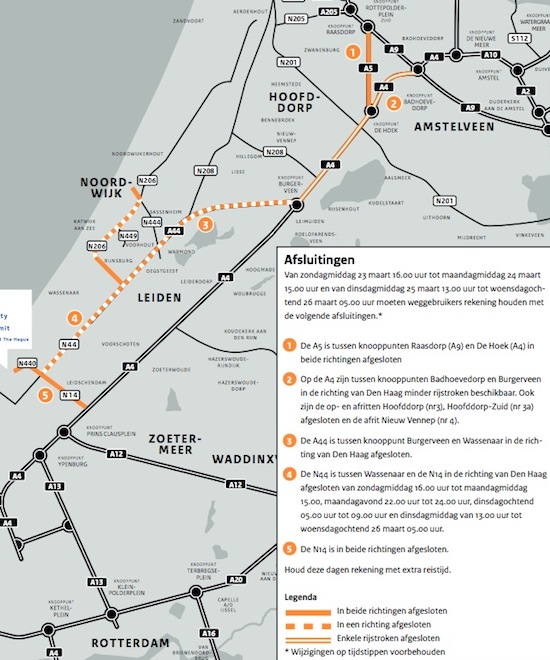 The following restrictions apply from 23 march 16.00 hrs until 24 march, 15.00 hrs, and from 25 march 13.00 to 26 march 05: 00. A number of A-roads go on those two days, in whole or in part on lock. The A5 is completely closed, on the A4, this is limited to a number of lanes between Burgerveen and Badhoevedorp. The N14 and the N440 at The Hague all the way down and on the A44 and N44 is the way in one direction to close.