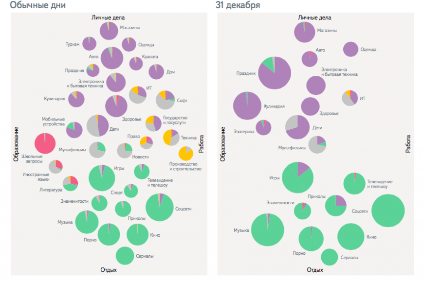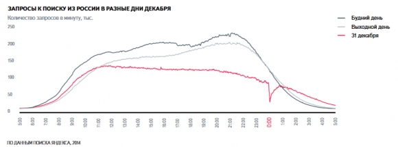 Naturally, a user’s search activity is reduced in the New year’s eve — 25% less than average on weekends and 35% less compared to weekdays. Five minutes to midnight the number of requests falls cutting and to 00:40 is restored. As noted by Andrew Sebrant, Director of marketing services company, midnight actually looks like the accident on the network.