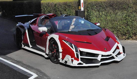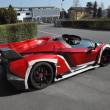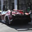 Still wet behind the ears and with the tape still around his body, this Veneno Roadster for the first time, sunlight, outside the Lambo factory in Sant’Agata.