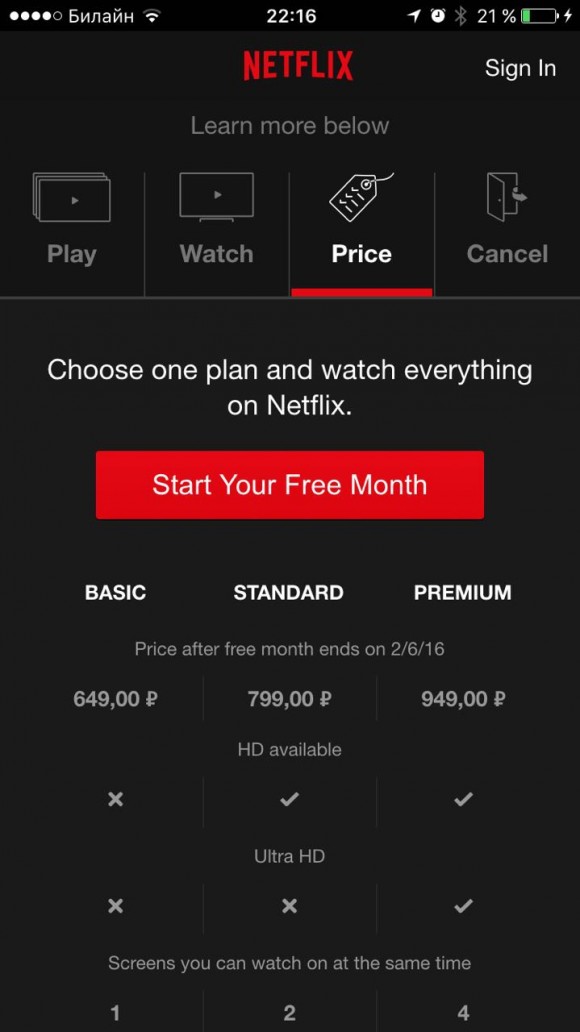 Als wir auf dem Screenshot zu sehen, in Russland sind die Preise in Rubel, obwohl die Schnittstelle noch auf Englisch. Das Abonnement kostet 649, 799 oder 949 Euro, abhängig von den ausgewählten Optionen.
