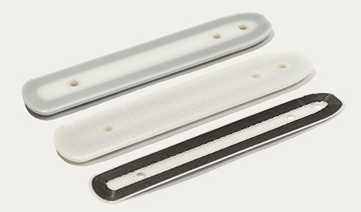 De tre objekter, laget av MarkForged, vise ulike punkter i prosessen. Den ferdige delen er en del av en racerbil spoiler.