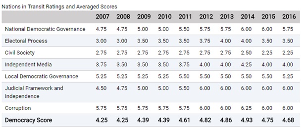 Ocena odbywała się w siedmiu kryteriów: proces wyborów, rozwój społeczeństwa obywatelskiego, wolność MEDIÓW, poziom demokracji rządu centralnego, poziom demokracji lokalnej kontroli, niezależność i praca systemu wymiaru sprawiedliwości i korupcja.