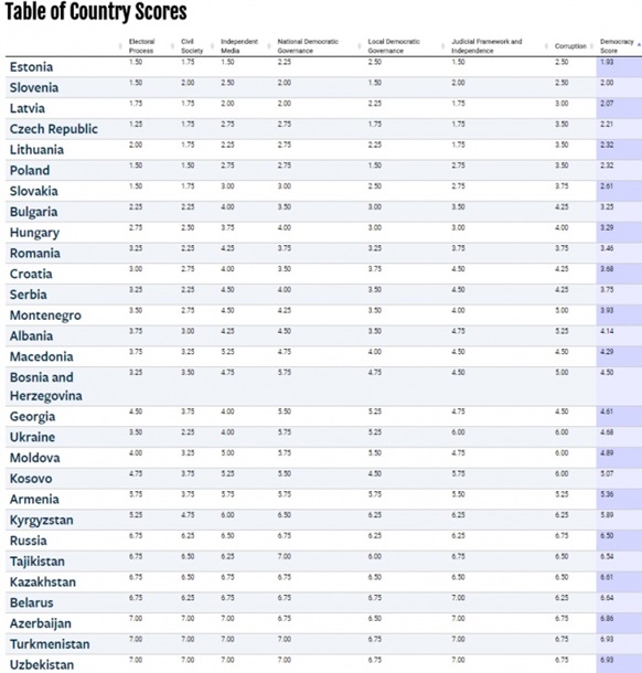 W pierwszej trójce rankingu weszli Estonia, Słowenia i Łotwa, które wpisane 1,93, 2 i 2,07 punkty odpowiednio i uznane za krajami z trwałego systemu demokratycznego. Najgorsze wskaźniki w krajach z autorytarny system polityczny Rosji i krajów-byłych członków ZSRR (Tadżykistan, Kazachstan, Białoruś, Azerbejdżan, Turkmenistan, Uzbekistan).