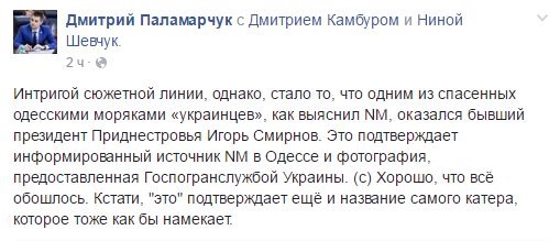 Wraz z tym, zastępca ministra spraw zagranicznych PMR Dmitrij Паламарчук u siebie na Facebook zaznaczył, że wiarygodność zdarzenia dodaje nazwę ocalałej łodzi – Janet (żonę Smirnowa na imię Жанетта).