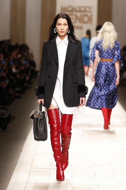 Bella Hadid wyszła na wybieg w seksownym stylu z czerwonymi ботфортами